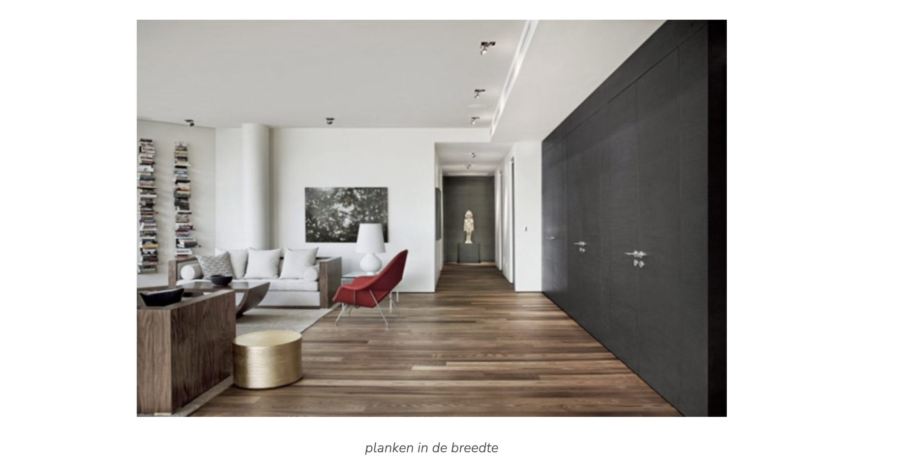 Het formaat van de plank speelt een grote rol in het optische effect van een kamer. Daarmee is het formaat van de kamer leidend. Heb je een grote ruimte dan geldt dat de ruimte langer maken en brede planken de ruimte breder. Is de ruimte niet zo groot? Dan maken juist smalle planken de ruimte groter.