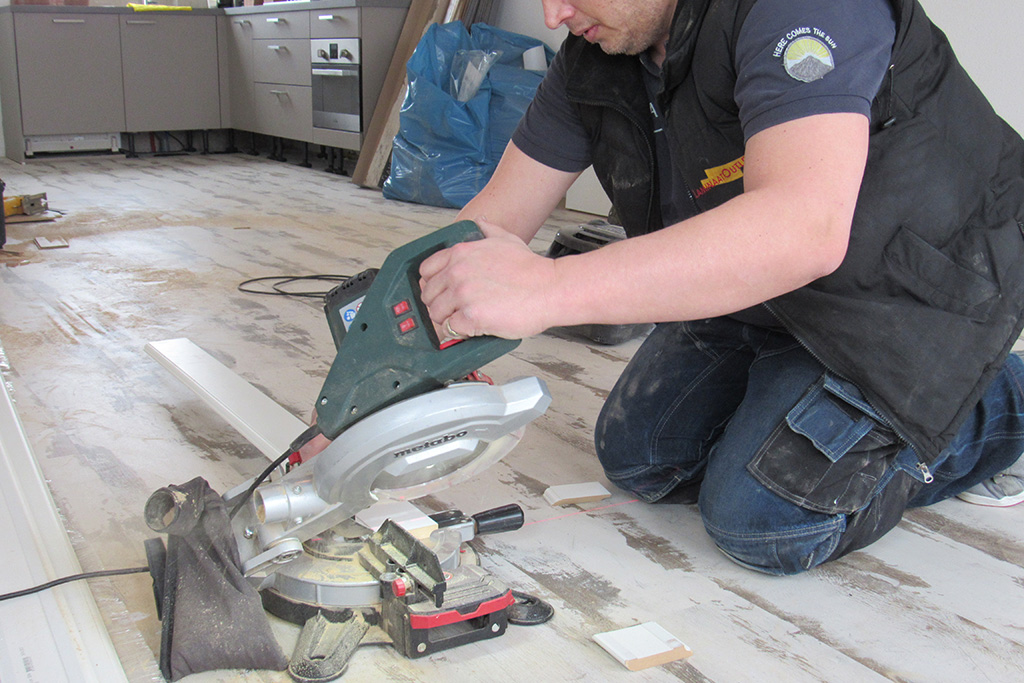 Ook de hoge plinten kunnen worden geschroefd. De meest gebruikelijke manier is echter om de plint tegen de wand vast te kitten. Er zijn kitsoorten bij LaminaatOutlet verkrijgbaar die de plinten stevig bevestigen en die ook makkelijk van de muur zijn te verwijderen wanneer de plint wordt verwijderd. De beste manier om de plint te bevestigen met kit is door dotjes verspreid over een lengte van +/- 20 cm te spuiten. Het is belangrijk om de plinten die in de hoeken komen eerst in verstek te zagen met een afkort zaag. Hiermee kan je de plinten op 45º graden zagen zodat de twee uiteindes in de hoek mooi tegen elkaar aan worden bevestigd.